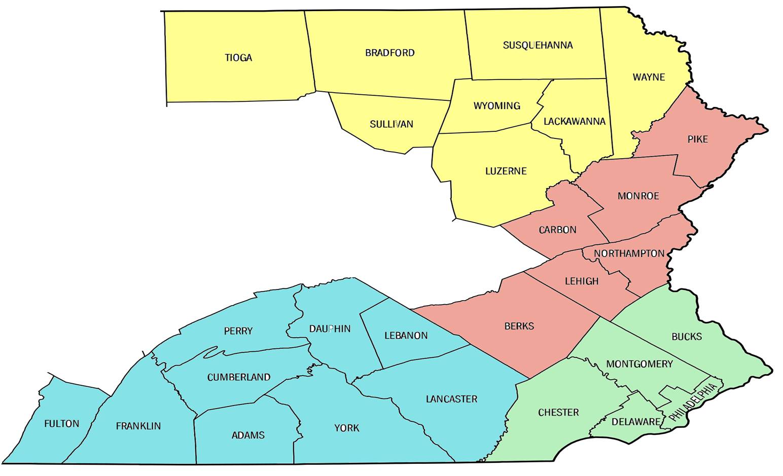 • Northeastern - Lackawanna/Susquehanna, Luzerne/Wyoming, Bradford/Sullivan, Wayne, and Tioga • Eastern - Carbon/Monroe/Pike, Berks, Lehigh, and Northampton • Southeastern - Bucks, Montgomery, Chester, Delaware and Philadelphia • South Central - Cumberland/Perry, Franklin/Fulton, York/Adams, Dauphin, Lancaster and Lebanon